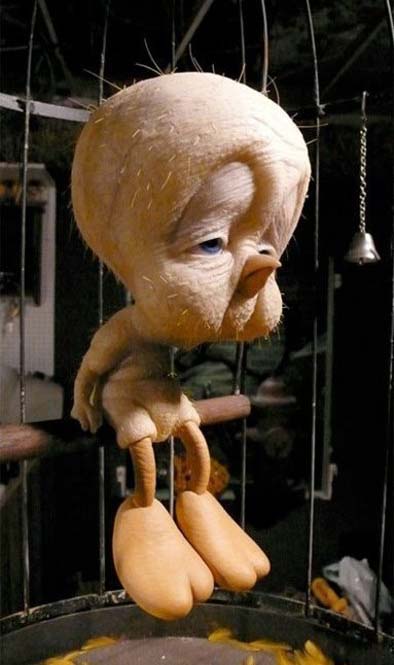 Tweety Bird will be 60 this year. As seen in this photo years of partying and women have turned this one time top star into an old worn out hasbird living in a single room cage with week old newspaper covering the bottom.....