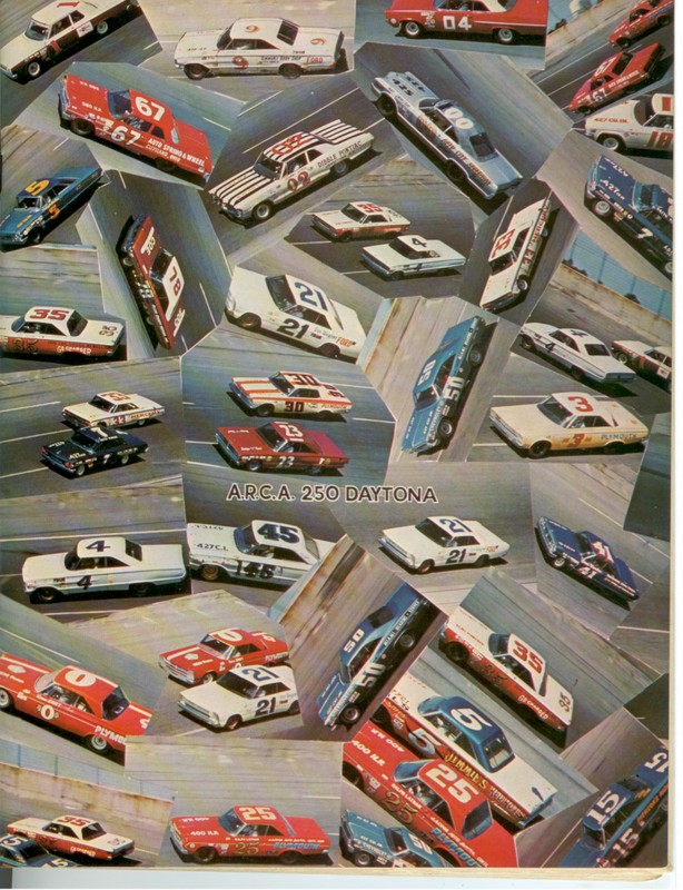 From an old Racing Pictorial... Man were these cars ever STOCK!! Just 33 cars started the race that year... It was won by Jack Bowsher in a 1966 Ford (#21)... Ramo Stott in the #0 was second followed by Andy Hampton #35 and Ernie Derr (The top guy from the old IMCA Stock Car circuit) in the #1... Some others I can recognize are Ralph Latham in an old Ray Nichels Plymouth #25 and USAC driver Sal Tovella in the #5 Mercury... Check out two cars that had to come off some show room somewhere... the #02 Pontiac of Johnny Ditch and the #00 Buick of Ray Daniels... The only guy running a Pontiac at that time in NASCAR was H.B. Bailey and no one was running a Buick back then...