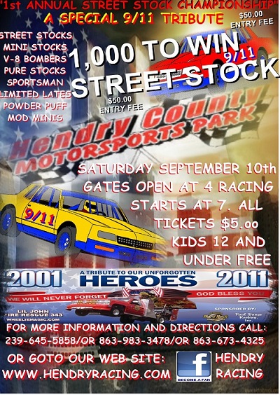 Join us Saturday night September 10th at The Hendry County Motorsports park as we pay Tribute to those who gave there lives selflessly on 9/11/2001. All, fire dept, sheriff, police, military, state troopers, FWC, any Emergency Service Personal will get in absolutely Free. There will be special performance from American Rescue Party 343 Inc. and a special 30 lap Street Stock 9/11 Tribute Race. Also racing will be Open Wheel Modifieds, Mod Minis, Pure Stocks, Sportsman, Limited Lates, Mini Stocks, V-8 Bombers, Kids bike races, and The Ladies Powder Puffs. Front gate admission is only $5.00, kids 12 and under are Free and all Emergency Services Personal are Free. Gates open at 4 racing starts at 7. For more information go to our web site www.hendryracing.com