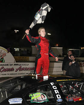 When the action slows down we tend to find the best images frozen in time. Michael Fettig captured an image of Becca Kasten showing her pleasure not just for winning, but also in a salute to her fallen sister in victory lane at New Smyrna Speedway (FL) during Speedweeks. Kasten lost her twin sister just a few weeks prior to the February event. Then, with her sister as her co-pilot, Kasten won her first race of 2011.