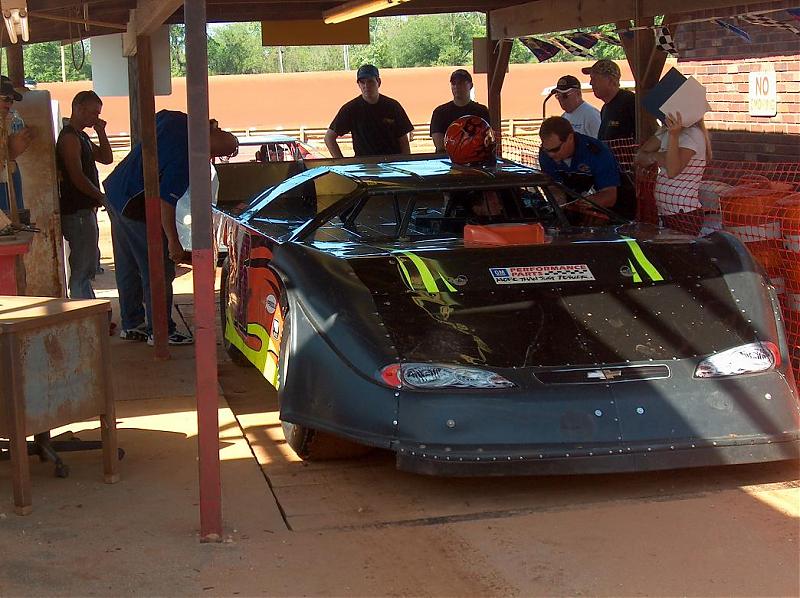 Man you talking about a good weekend of racing. It don't get any better. We cruised into Phenix City Alabamba about 1:00 in the afternoon Sat and we had a line of haulers waiting to get in. The pits didn't open till 3 so they had a wait. Groups of them were out side with their lawn chairs just chilling. We went in and begun putting up all our banners for our sponsers and preparing for an awesome night of racing in absolute great weather. We ran thru a little rain in Ga but I think about Albany the blue skys appeared ane the rest of the day and night were beautiful, although it got a little cold. I went up on a tower above the press box/ suites to tape the racing and I left my jacket in the trailer. It didn't take long to realize that was a mistake. When we started registering Drivers, they just kept coming. We had a record number of cars for this show, 47. And man what a show. The track was the best dirt track facility I have ever seen, they have their poo together. The track is run by a woman and she seems to know her stuff. She has executive suites above the grandstands with couches and tables kinda like Nascar. The track is banked 18 degrees up top and goes to about 15 degrees lower and almost flat on the bottom. The racing surface was supurb. It is wide enough for 4 wide racing, and we saw it at times Sat. The clay was outstanding and they really work at it. The locals seemed to have a advantage over our traveling cars a little. All the locals seemed to ride the rim of the track, but as we saw that takes some experience there is no outside wall except on the front straight. Cars can, and did go over the rim and off the track. They would disappear over the top and reappear a few minutes later. I will post some pics below. I wish you all could have been there. I don't know of any thing I could have done last weekend to enjoy any more. My buddy Jim and I were up on the tower where I taped before our races started and we decided ther was no better fun we could have with our pants on. Especially at our age.LOL! Thanks Bob........