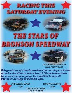 No Ted, I had already made plans to be at Bowman Gray Friday and Saturday since we were off this weekend. They put the MODs back on for a no points race and I'm not canceling my reservations. With the big MOD race at NSS, it might effect this race at Bronson. Just don't know.