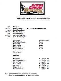 The schedule is on the front page every week of www.citruscountyspeedway.com or facebook page etc. I did a screen shot photo up close and reposted but it does not get bigger as a attachments and for some reason I or maybe others can not copy and past on here as I used to do....not sure about why.