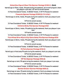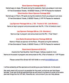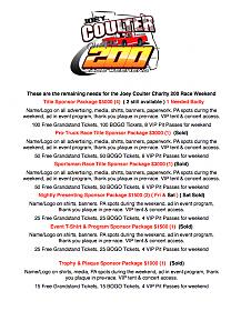 Well here is an update of where we are at as we prepare for the closing months for the Joey Coulter Charity 200 Race Weekend. These are the sponsor needs including the laps and awards we need to begin the push for. I will announce a deal for all those that purchase laps and what you have the chance to win when you buy them. If you can help with any of these remaining needs please call me 407-497-0448 or e-mail me at rbmini68@aol.com and let me know. I will post award and laps separate in the coming days. Thank you to those who have already helped and those who may be able to right now. I do have a couple people that may be trying to fill the need of the one lost $5,000 sponsor, if you can help please let me know. Please share this and send to those that might be able to help. Anything is appreciated the push is on !!! Its for the kids !
