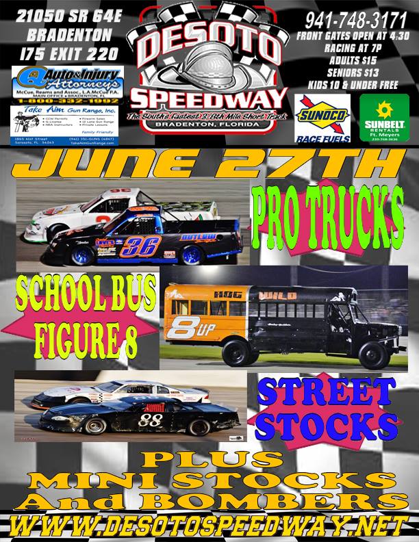 Desoto Speedway Saturday Night June 27th the Q Auto and Injury Attorney Pro Trucks along with the Take Aim Gun Range Street Stocks, Mini Stocks, Bombers and the Fan Favorite Wild and Crazy School Bus Figure 8 Return to the High Banks of the South's Fastest 3/8th Mile of Desoto Speedway. Bring the entire family out for a evening of fun. We offer full concession stand, souvenir shop, pub and full bleacher seating.