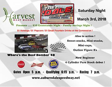 for the second time early this racing season Auburndale Speedway and Harvest Meat Markets are holding another "Family Savings Night" this Saturday evening as once again it will be $10 grandstand admission for everyone aged 13 and up. Thanks again go out to marketing partner Harvest Meat Markets along with owners Ed and Anita Kirkland. Harvest has locations in Auburndale, Lakeland, Kathleen, Lake Alfred and Highland City. As a part of the evening, concession stand specials will once again be available including $1 hot dogs, popcorn and small fountain drinks.