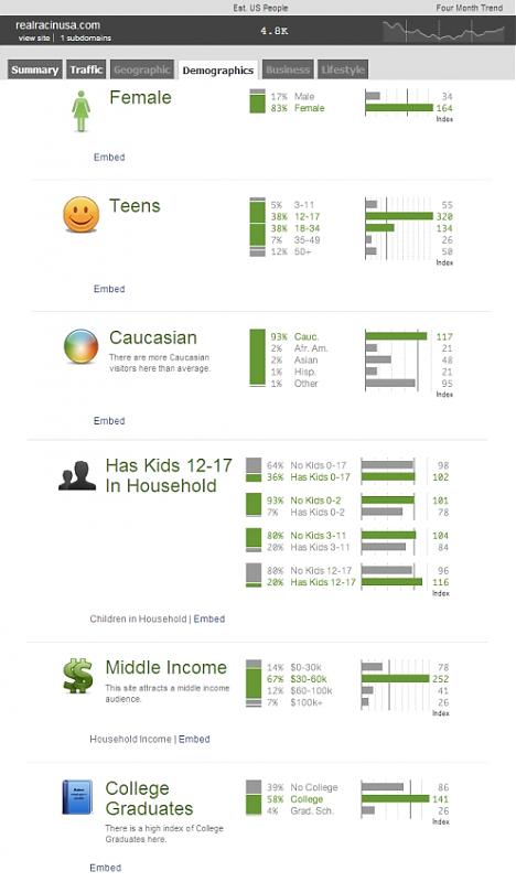 It just kind of shows that, male vs. female, we have more females than a website typical of ours. Then we have more teenagers than a typical website of ours would see and so on and so forth. I'm actually willing to bet that that huge spike in teenage activity we saw in that online awards debacle (I forget who the teenage driver was that was getting all of the votes) is skewing most of these stats because this isn't what I expected to see.