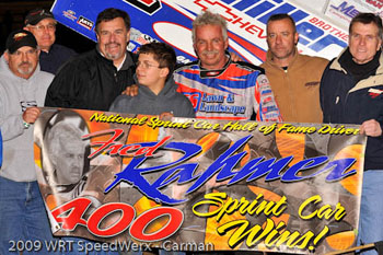 ABBOTTSTOWN, PA, 4/4/09 - It was all about redemption Saturday night. Salfordville's Fred Rahmer, the winningist driver in the history of Lincoln Speedway, had failed to qualify for the first time the last time out. Saturday night, the ten-time track champion had only one thing on his mind - winning. Ninth-starting Rahmer passed Wellsville's Scott Geesey on the backstretch of the tenth lap and then held off the charges of defending track champion Brian Montieth and young hot shoe Cody Darrah over the final laps to register his 400th career sprint car win. "After last week, I had to come back here and redeem myself," said Rahmer upon exiting his Chad and Jenn Clemens-owned No.51 sprint car in victory lane. "I embarrassed myself last week and let everybody down. I've never failed to qualify here before, and I just didn't get the job done" Outside front row starter Chad Trout grabbed the lead at the outset over polesitter Tim Glatfelter. Third-starting Geesey snatched the runner-up spot on the third lap when Glatfelter spun and collected Lance Dewease. Meanwhile, Rahmer charged up from his fifth-row starting spot to pass fourth-starting Brent Marks for third on the third lap. Geesey passed Trout for the lead in the third and fourth turns of the sixth lap, while Rahmer continued his relentless charge to the front by passing Trout for second on the eighth lap. Rahmer quickly closed the gap on the Geesey and made the pass for the lead heading up the backstretch on the tenth lap. A Chris Knopp spin on the lap 11 allowed Geesey to close on Rahmer's bumper for the restart. But all eyes were looking behind them, as tenth-starting Montieth was closing fast in third. Montieth passed Geesey on the restart for second and began to chase Rahmer for the lead. But Geesey fought back to retake the runner-up spot on the 16th lap, with Jimmy Siegel and another hard charging driver --Cody Darrah-- coming on strong right behind. Darrah passed Montieth for third with five laps to go and then the final caution waved with two laps to go for a spinning Cory Haas in turn four. When Darrah passed Geesey on the restart, the packed grandstand stood in unison as the final laps wound down. But Rahmer had his redemption, holding off the popular young driver from Red Lion to take the checkered .75-seconds ahead for his milestone 400th career win in a sprint car. "It's not hard to look humble when you didn't even make the show last week," said Rahmer on winning race number 400, "It's pretty overwhelming to win 400 races out here with the group of guys I raced with...I've accomplished way more than I ever thought I would." Geesey hung on for a well-deserved third place finish, with Montieth fourth and 14th-starting Doug Esh fifth. Completing the top ten were Siegel, Alan Krimes, Chad Layton, Brent Marks, and 21st-starting Cris Eash. "The track was challenging tonight," said Rahmer. "It was slick in one and two and a little upsetting in three and four...I'm just awful proud of my boy and every body that works on the car." "It goes like that sometimes, and you have just to ride it out. That's why we run 100 times a year." Heats for the 27 "410" sprinters were won by Glatfelter, Dewease, and Trout, with Niki Young winning the consolation.